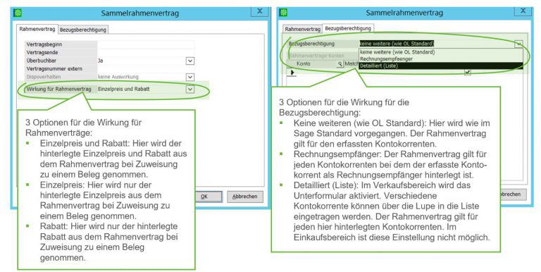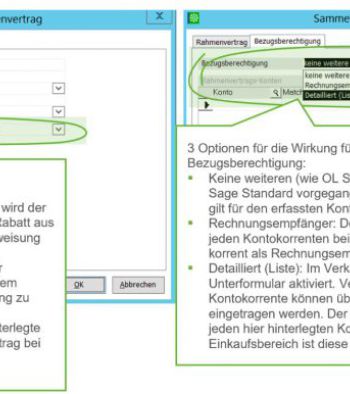 Des Weiteren ist es möglich Rabatte zu erfassen. Somit ist es möglich die im Rahmenvertrag hinterlegten Preise und/oder Rabatte für die entsprechenden Belege zu übernehmen. Ohne diese Erweiterung ist es normalerweise bei der Sage 100 nicht möglich bei Rahmenverträgen Rabatte und bestimmte Bezugsberechtigungen zu hinterlegen.
